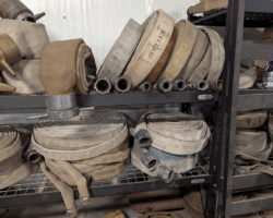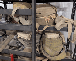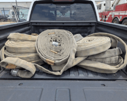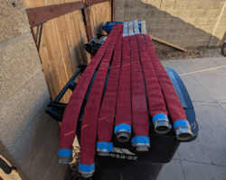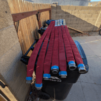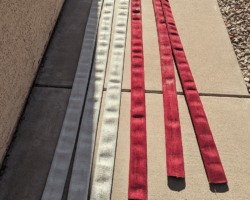 The Hall of Flame, a local firefighting museum, seemed like a good option, but they wanted a large donation before they could part with the hose, and I didn’t have the budget for that. An agency way out west of Phoenix contributed a couple of hoses, but they turned out larger and heavier than practical. Finally, after running all around town, I managed to get enough hose of the same diameter from the Phoenix Fire Department. They had pallets and pallets in their inventory yard, and generously provided eight hoses of the same size (complete with brass couplings). Thanks, guys!