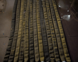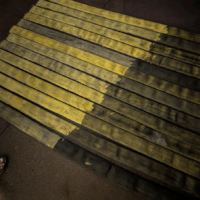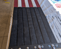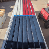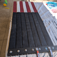 I knew I’d need paint as well as a way to hold everything together at the top. Since the stripes would hang freely, with nothing holding together, the flag would rely on gravity to keep it all together. I decided to create a “hose sandwich,” with two strips of wood and heavy-duty bolts holding them together. To make the flag easier to hang, I made every third bolt (numbers 1, 4, 7, 10 and 13) an eyebolt.