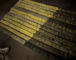 It occurs to me right as I’m looking at these photos that what I created is, in fact, an American flag, and it’s trailing on the ground. I’m also seeing photos where the individual stripes are laid out on the sidewalk, and another where the red-painted hoses are laid across two garbage cans to keep them out of the way. Question for the audience: At what point does a bunch of paint and fire hose become an actual version of Old Glory, which shouldn’t be allowed to touch the ground? That’s an interesting philosophical (and practical) question. Aside from the playhouse, which wasn’t really tall enough, I didn’t have anywhere to hang the flag to get a photo. Hmmm…