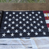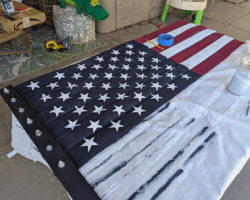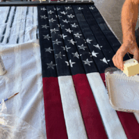 Since the flag would be hung from an open balcony, it needed to be two-sided, painted on both sides. I began by marking off the rough area for the blue union, then painting the red and white stripes. The fabric-covered hose really sucked up the paint, so I gave it two coats. Once one side was dry, I flipped it over to paint the other side.