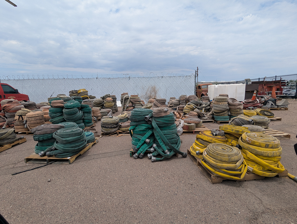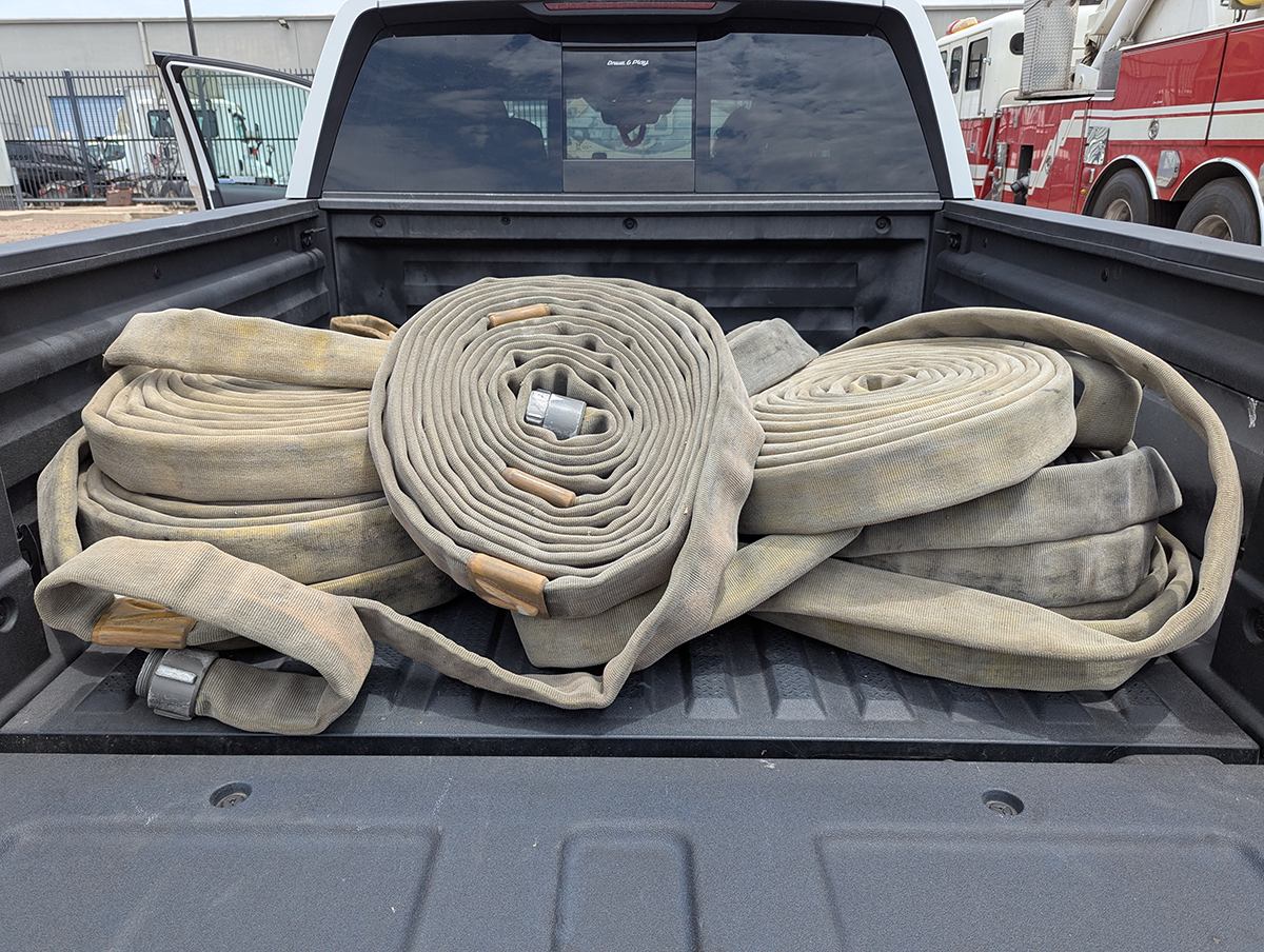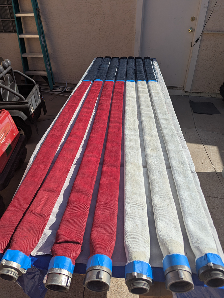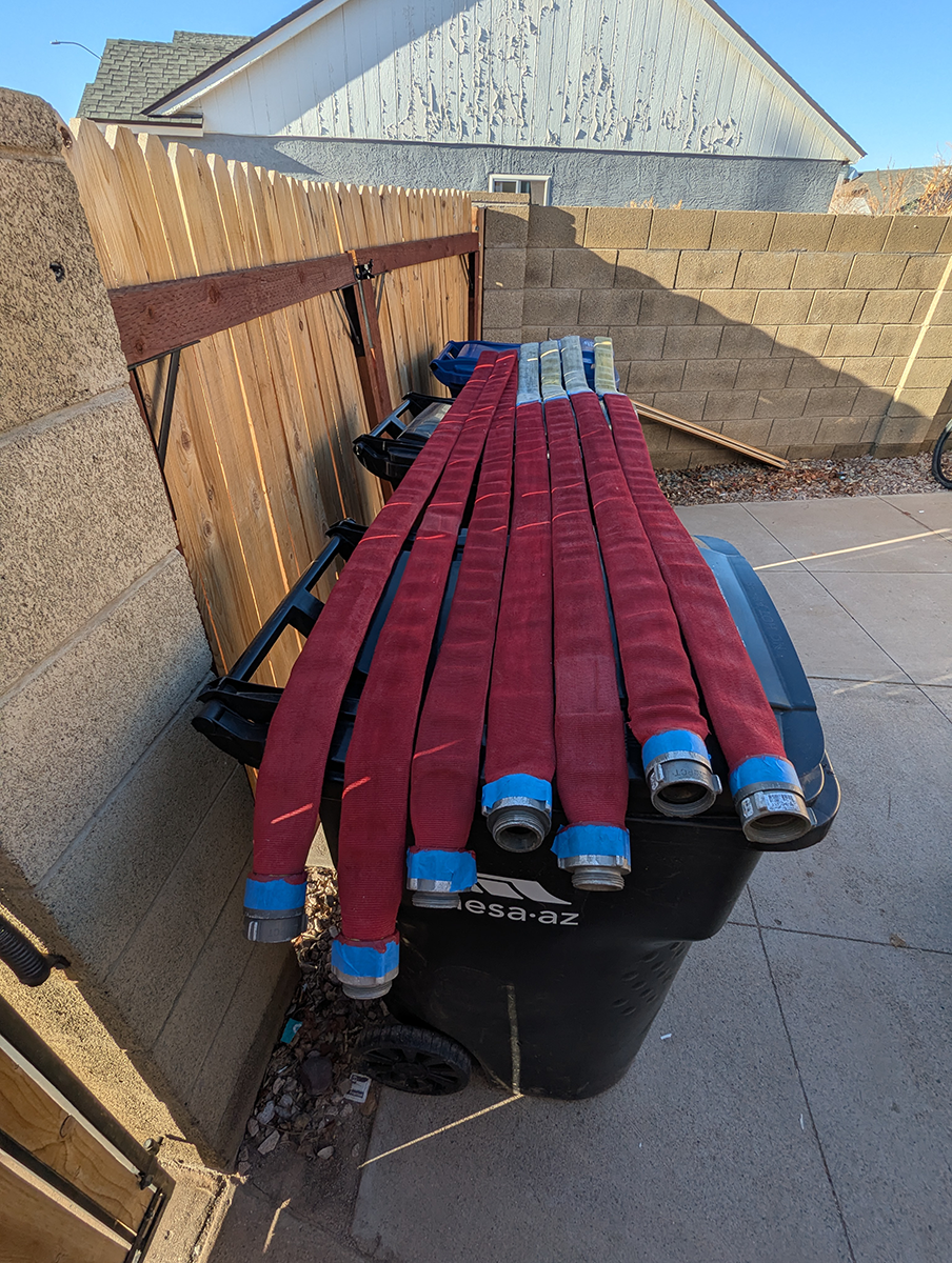 The Hall of Flame, a local firefighting museum, seemed like a good option, but they wanted a large donation before they could part with the hose, and I didn’t have the budget for that. An agency way out west of Phoenix contributed a couple of hoses, but they turned out larger and heavier than practical. Finally, after running all around town, I managed to get enough hose of the same diameter from the Phoenix Fire Department. They had pallets and pallets in their inventory yard, and generously provided eight hoses of the same size (complete with brass couplings). Thanks, guys!