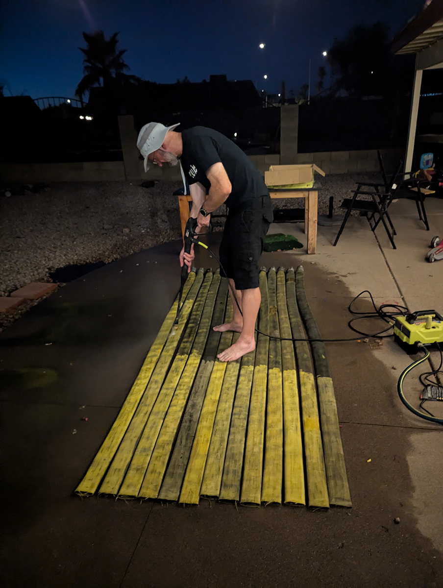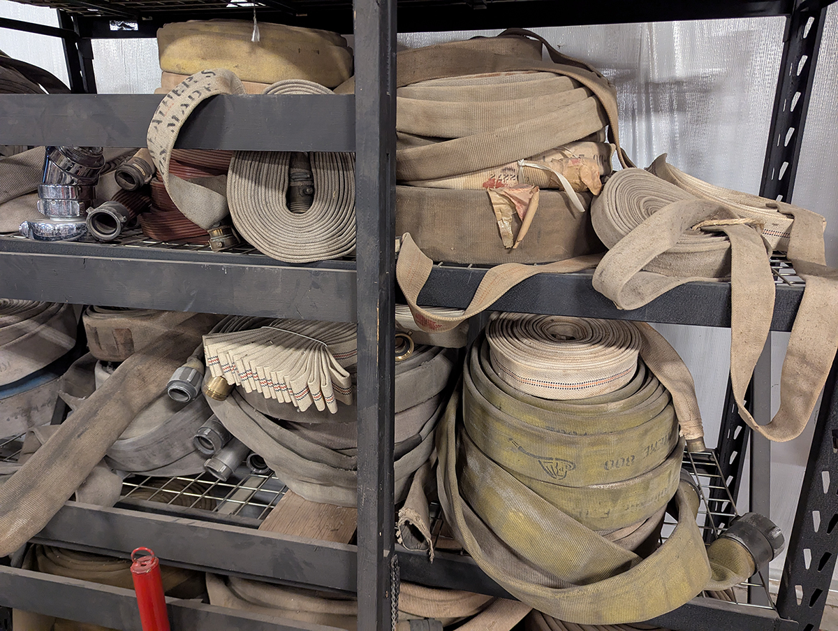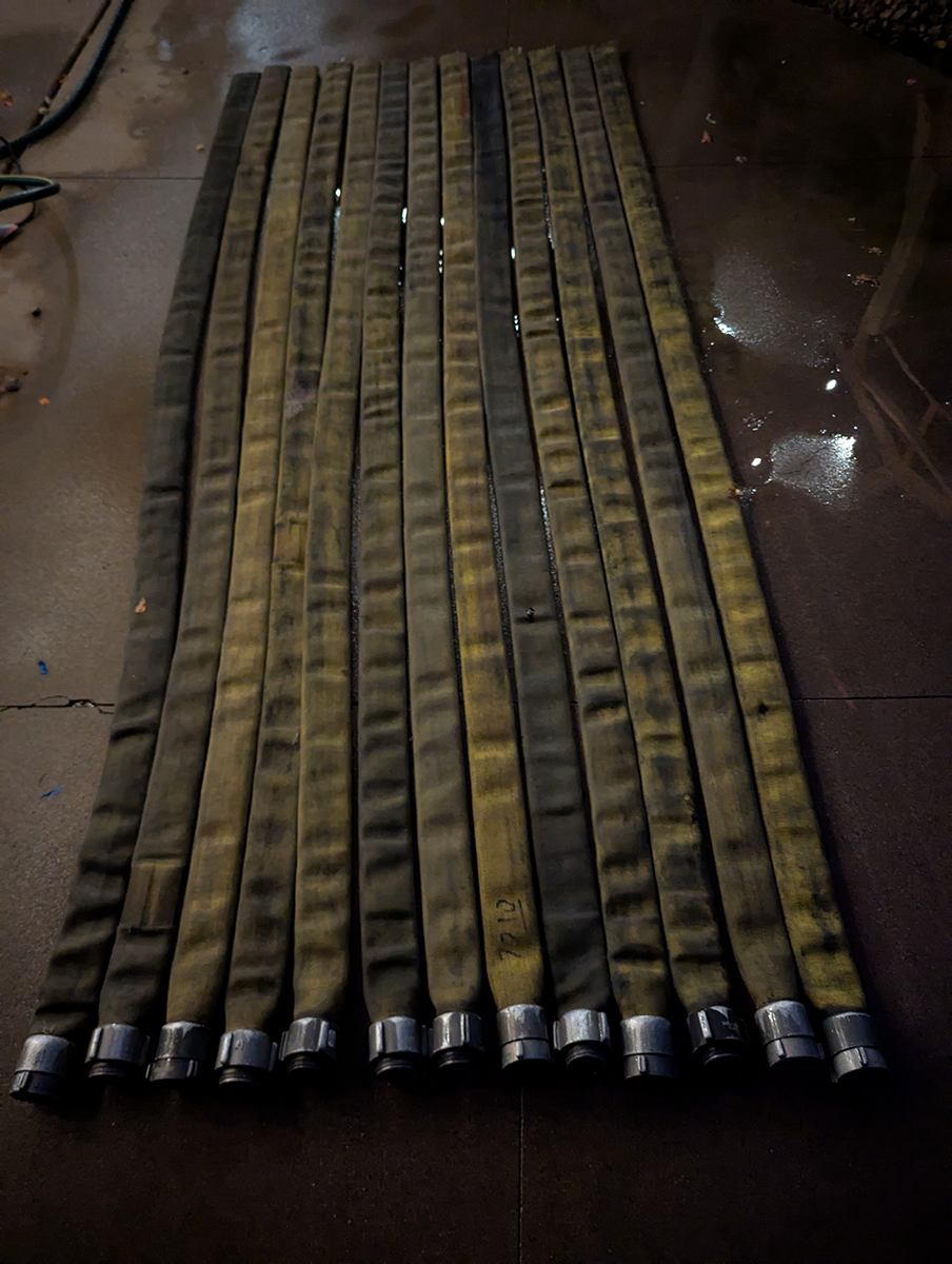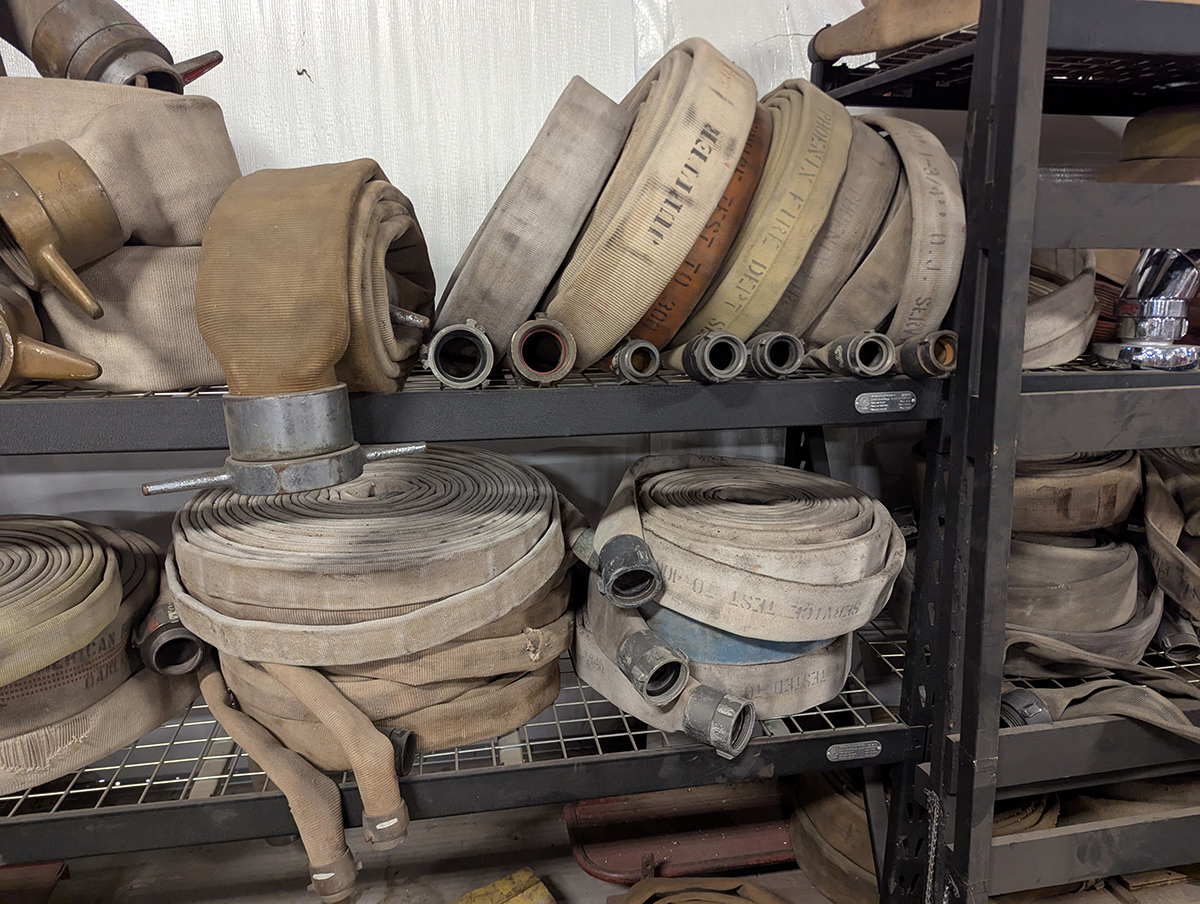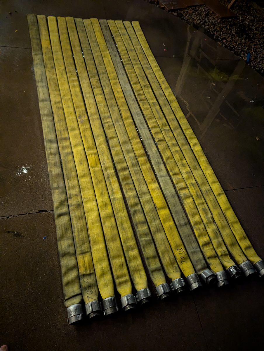 The Hall of Flame, a local firefighting museum, seemed like a good option, but they wanted a large donation before they could part with the hose, and I didn’t have the budget for that. An agency way out west of Phoenix contributed a couple of hoses, but they turned out larger and heavier than practical. Finally, after running all around town, I managed to get enough hose of the same diameter from the Phoenix Fire Department. They had pallets and pallets in their inventory yard, and generously provided eight hoses of the same size (complete with brass couplings). Thanks, guys!