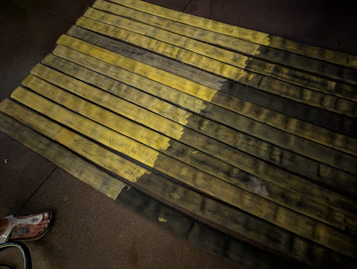 It occurs to me right as I’m looking at these photos that what I created is, in fact, an American flag, and it’s trailing on the ground. I’m also seeing photos where the individual stripes are laid out on the sidewalk, and another where the red-painted hoses are laid across two garbage cans to keep them out of the way. Question for the audience: At what point does a bunch of paint and fire hose become an actual version of Old Glory, which shouldn’t be allowed to touch the ground? That’s an interesting philosophical (and practical) question. Aside from the playhouse, which wasn’t really tall enough, I didn’t have anywhere to hang the flag to get a photo. Hmmm…