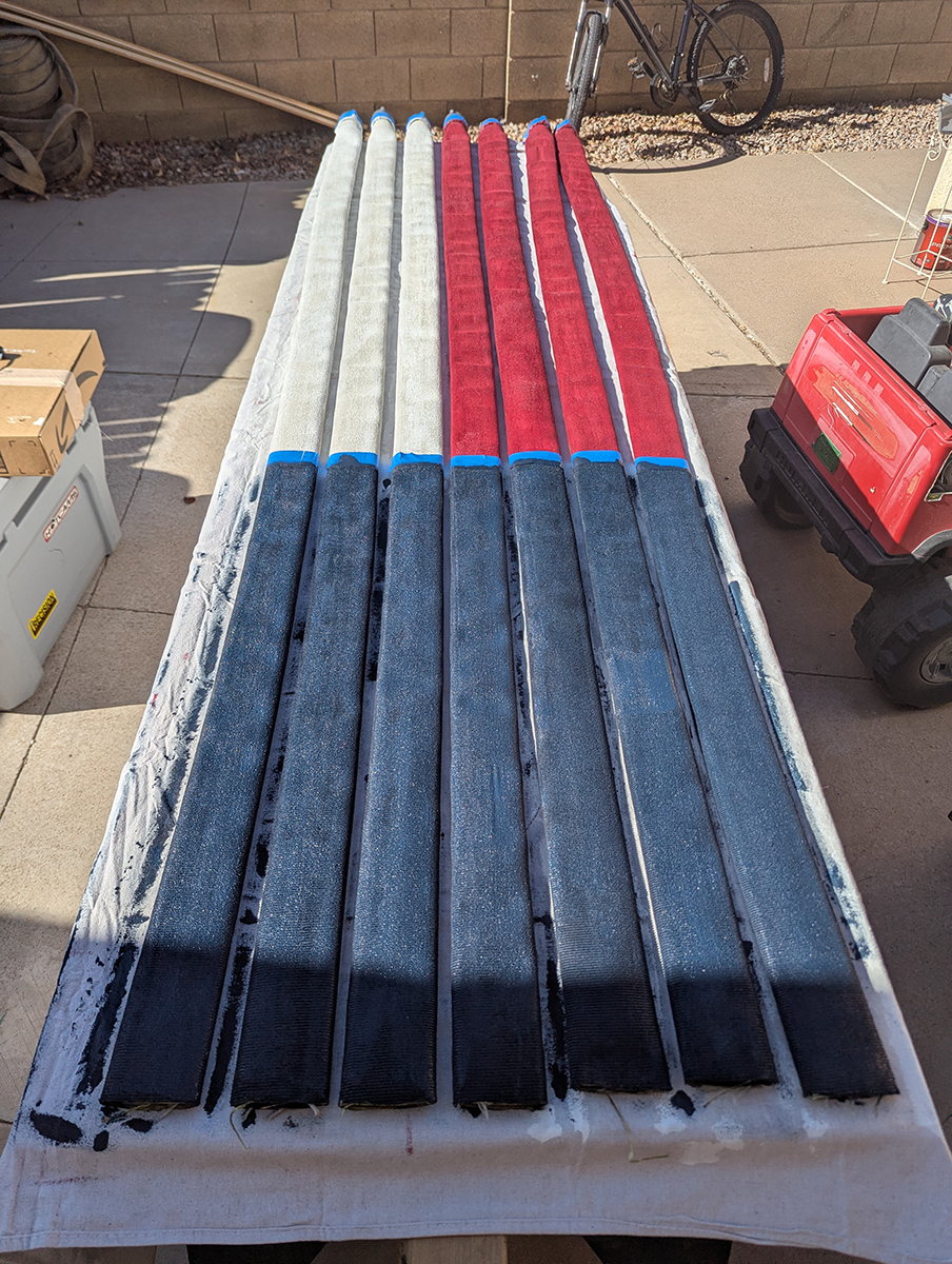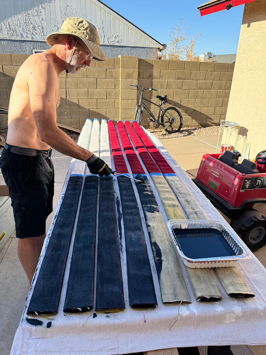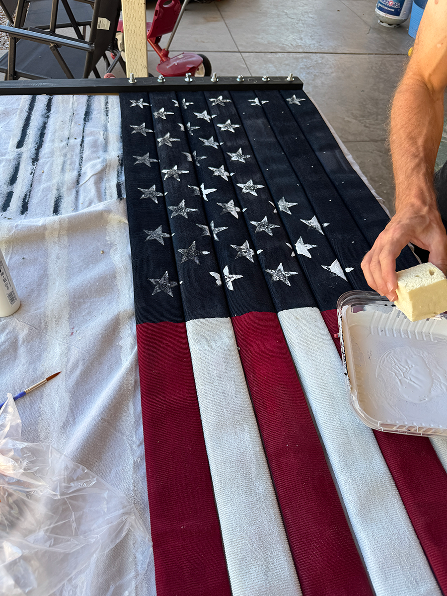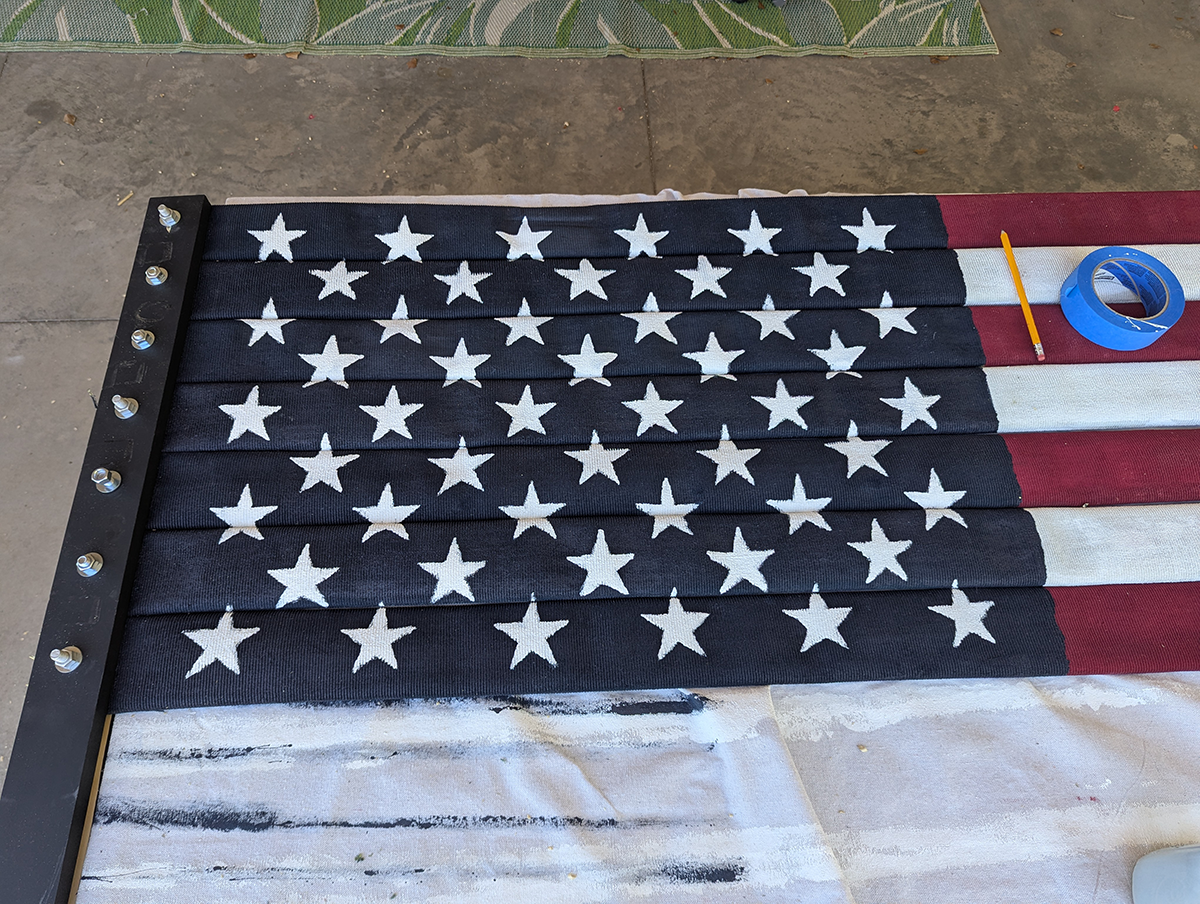 Since the flag would be hung from an open balcony, it needed to be two-sided, painted on both sides. I began by marking off the rough area for the blue union, then painting the red and white stripes. The fabric-covered hose really sucked up the paint, so I gave it two coats. Once one side was dry, I flipped it over to paint the other side.