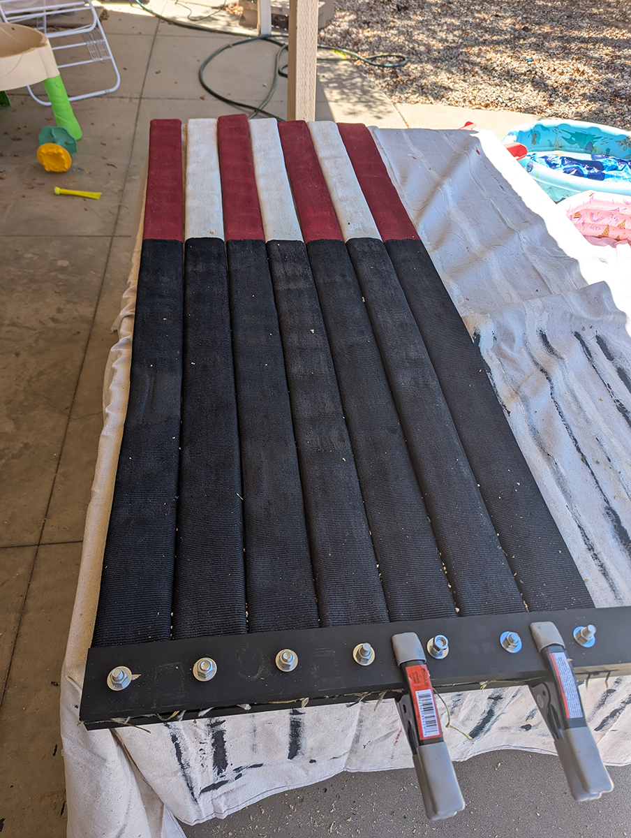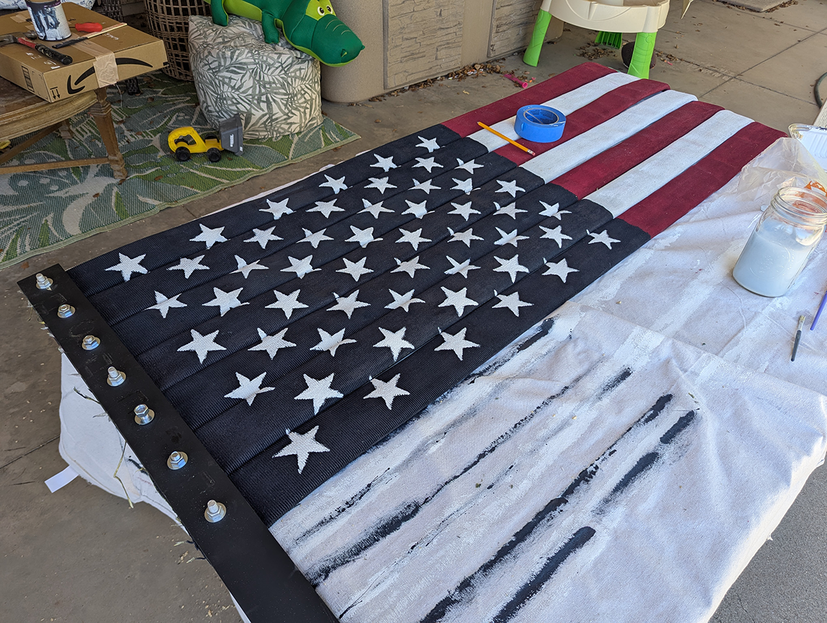 I knew I’d need paint as well as a way to hold everything together at the top. Since the stripes would hang freely, with nothing holding together, the flag would rely on gravity to keep it all together. I decided to create a “hose sandwich,” with two strips of wood and heavy-duty bolts holding them together. To make the flag easier to hang, I made every third bolt (numbers 1, 4, 7, 10 and 13) an eyebolt.