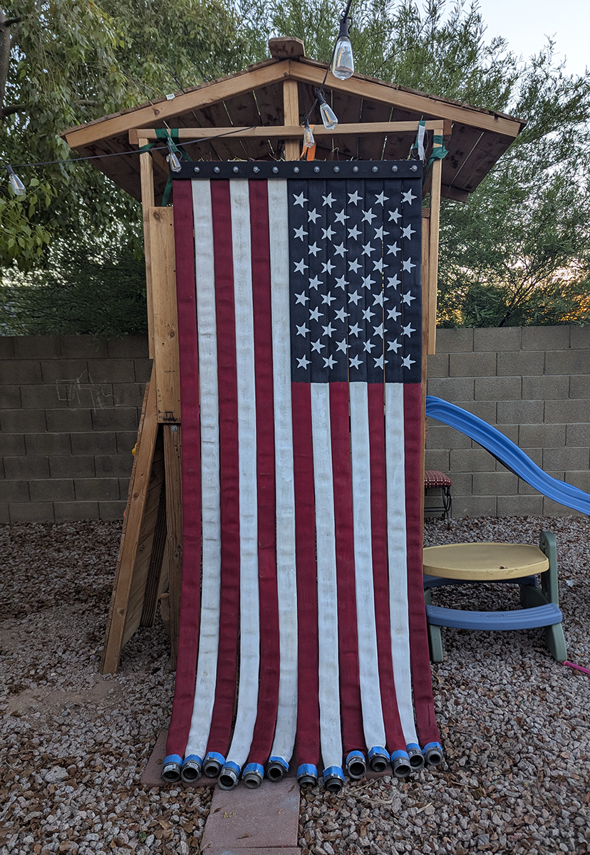 Once the painting was complete, we hung the flag up to take a few photos for our events director. Fire hose is heavy, and it took three of us to hoist it up on the children’s playhouse.
