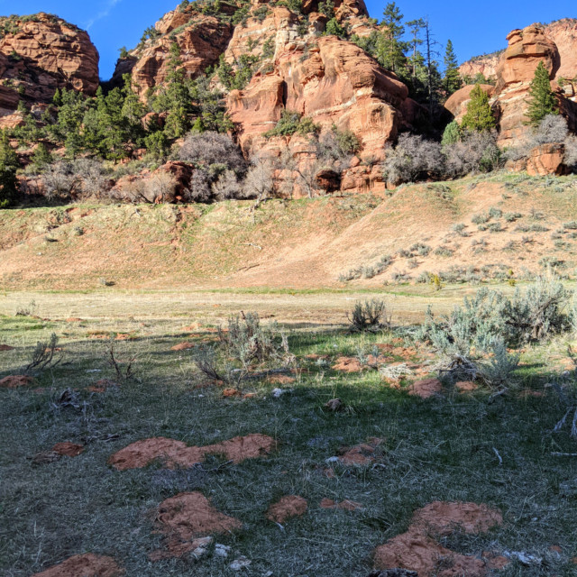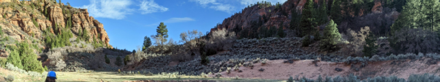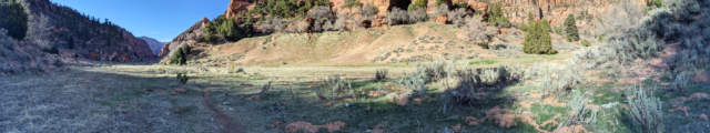 More slowly now, we hiked through Hop Valley toward the Kolob Canyon Arch. The narrow creek meanders through a wide, cliff-lined valley, forcing us to cross it again and again. Both of my running companions were struggling, but they gamely soldiered on. Besides the amazing scenery, I was mostly focused on forward momentum. When we reached Beatty Spring, near the entrance to the Kolob Canyon Arch side-trail, we still had plenty of water. Instead of stopping, we continued pushing ahead to make the most of what little daylight we still had.