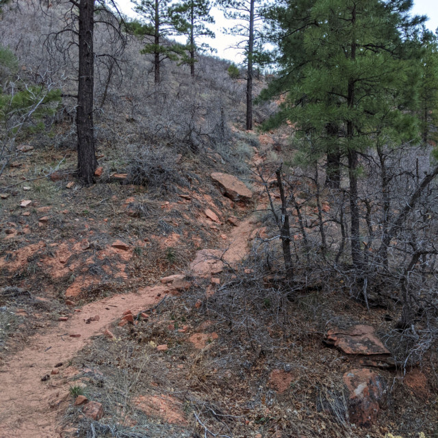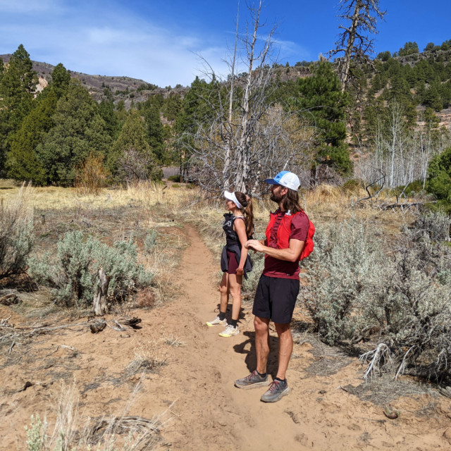Now we were on the ridge, and the ups and downs were more gradual. Taking the left-hand fork, we ran the long stretch through Potato Hollow to the junction. Some of the views along this section of trail literally take your breath away, and we stopped a bunch of times for photos. Then, turning left, we headed through Wildcat Canyon, stopping at one of the springs to filter water. Next, we took the Connector Trail to the Hob Valley Trailhead, where we used the facilities and had another rest.